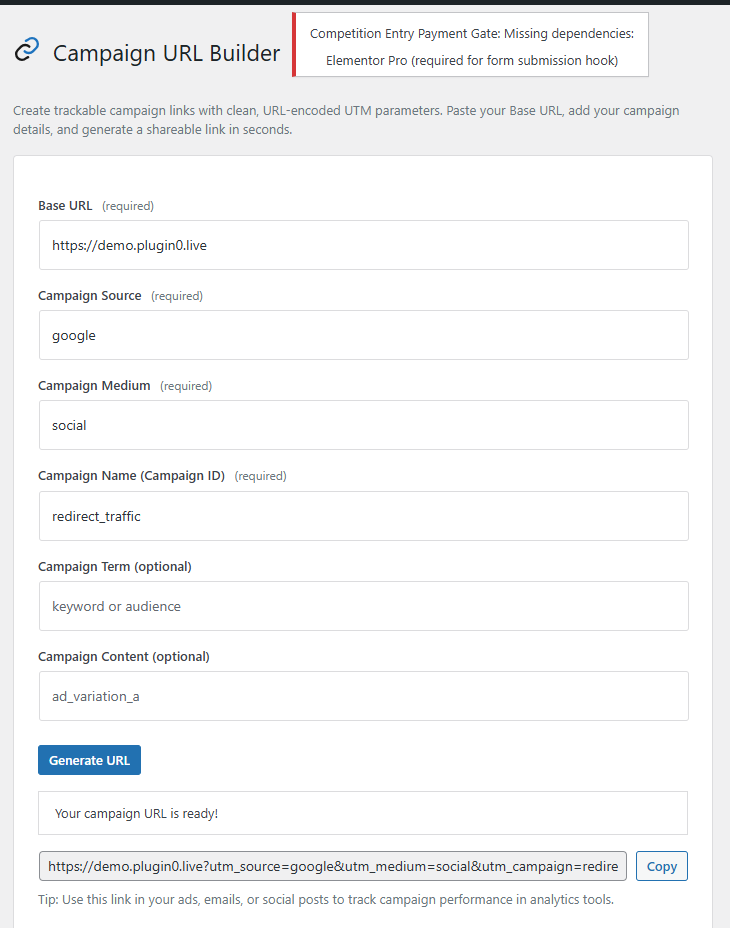 This plugin adds a 'Campaign URL Builder' tool to the WordPress admin under the Tools menu. On the Tools > Campaign URL Builder page, users can input a Base URL and the standard UTM campaign parameters: campaign source, campaign medium, campaign name (campaign ID), campaign term, and campaign content. When the user clicks "Generate URL", the plugin sanitizes all inputs, URL-encodes each parameter,